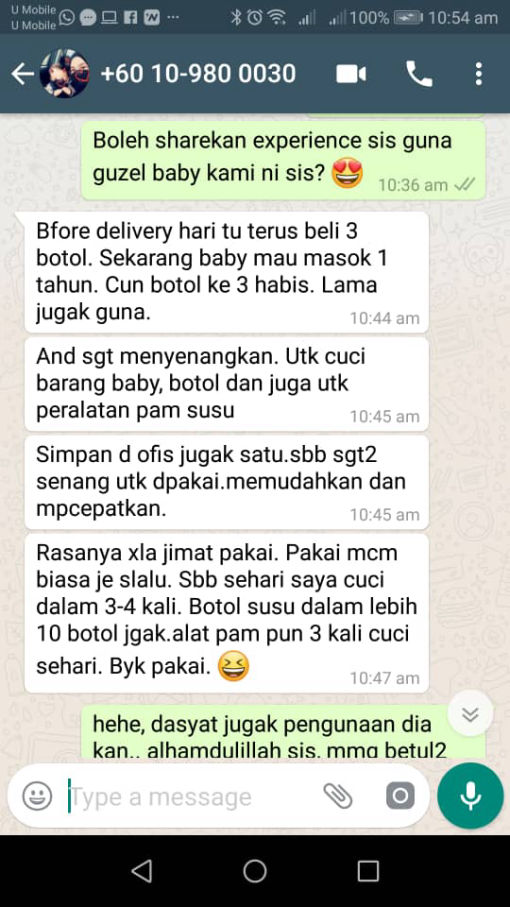 Jika ia digunakan didalam kuantiti yang disyorkan, sebotol Guzel Baby 500ml mampu bertahan lebih daripada sebulan. Walaubagaimanapun ianya bergantung kepada kekerapan penggunaan. Ada pengguna menggunakan Guzel Baby lebih 6 bulan bagi satu botol.